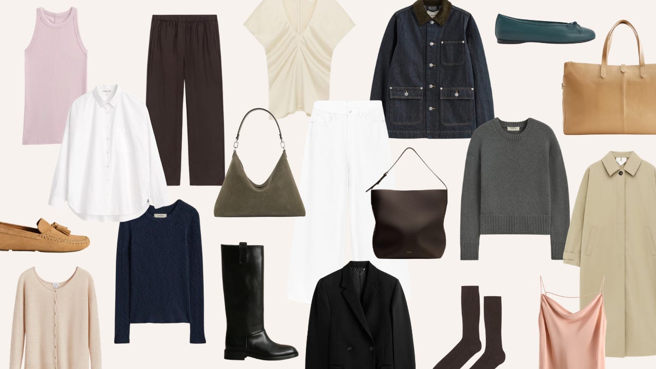 This image has pieces from Quince, Everlane, Arket, Cuyana, Jenni Kayne, Alex Mill, and Toteme. Can you tell which pieces belong to whom? Exactly.